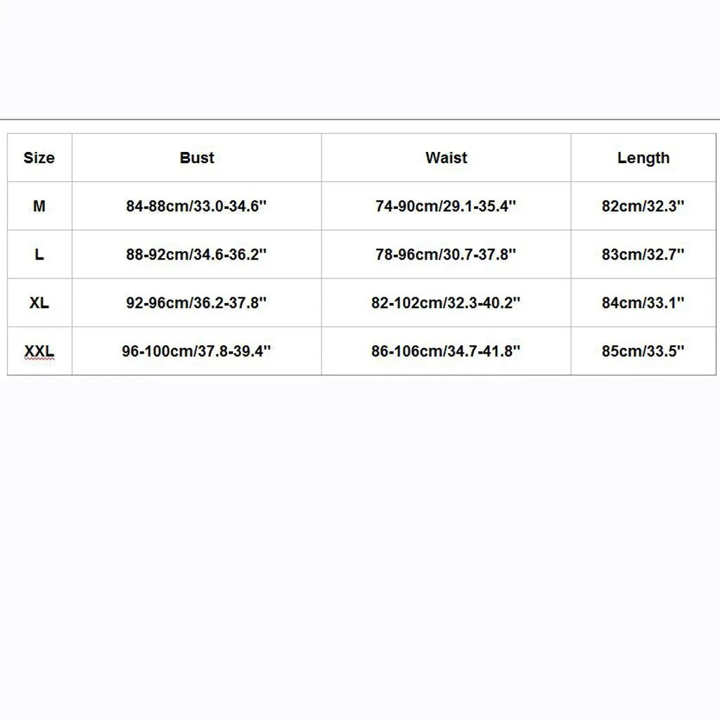 | Size:XXL | Bust:96-100cm/37.8-39.4" | Waist:86-106cm/34.7-41.8" | Length:85cm/33.5" |